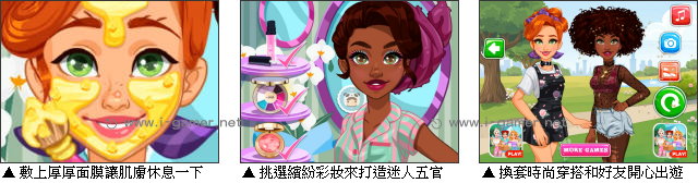遊戲操作:以滑鼠操作進行遊戲,點擊服裝、髮型、化妝品裝扮女孩們。
