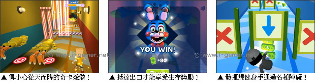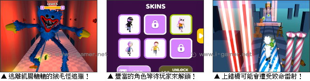 | 遊戲說明: 歡迎來到驚悚又刺激的《絨毛怪大追擊》世界!在這款結合《佛雷迪的五夜驚魂》和《波比的遊戲時間》怪物的跑酷遊戲中,玩家將扮演一名在廢棄工廠醒來的倖存者!你的目標沒有別的,就是逃離那隻飢腸轆轆,張著血盆大口的藍色絨毛怪追獵!  你需要在滿是致命陷阱的走廊飛奔,這裡除了崩塌的橋樑、冒火的電線和致命的雷射,甚至還會有從天而降的奇卡殘骸砸向你……因此想成功抵達遠處的出口離開,玩家只能發揮百分百專注及反應力,靈活利用跳躍、左右移動,再搭配上滑鏟,將擋路的敵人通通踹倒,才能清出一條生路!不過這條路上也不只有倒楣事。玩家可以沿路收集散落的鈔票或是提袋,以在結束後結算獎勵。至於這些獎勵可以做些什麼?  那當然就是解鎖各式各樣的角色嘍!除了熟悉的保安、滿頭白髮的瘋狂博士,玩家還可以變身詭異的紙袋男,挑戰不同的場景,享受戰慄的氛圍喔!究竟這場看似毫無盡頭的生死奔跑,最後的結局到底會是什麼呢?別想了,沉重的喘息聲已經在背後響起,現在就邁開腳步,在 Huggy Wuggy 張開雙臂之前,奮力向前跑吧! 遊戲操作:以鍵盤 WASD 鍵或方向鍵或滑鼠拖曳操控主角移動。