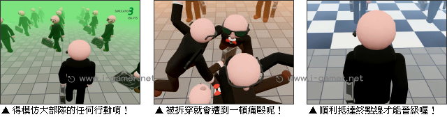 | 遊戲說明: 在《小心別露餡》遊戲中,玩家既不是英雄,也不是反派——你只是一個試圖混進大部隊的模擬者。這裡考驗的不是你的速度,而是觀察力與偽裝技巧。玩家必須完美模仿場景中其他角色的動作、行為與節奏,才能避免被發現身份、成功通關。 遊戲的玩法相當簡單,看到人群向前走就跟著走,拐彎就跟著拐,甚至跳起來時,也別忘落下,直到抵達畫著黑白格的終點區。但要小心,如果玩家的動作太慢或方向一下子搞錯,就會立刻被其他人識破,引來大夥群起圍攻唷!你能完美偽裝、毫不露餡的活到最後嗎?  遊戲操作:以鍵盤 WASD 鍵移動,空白鍵跳躍,C 鍵下蹲。