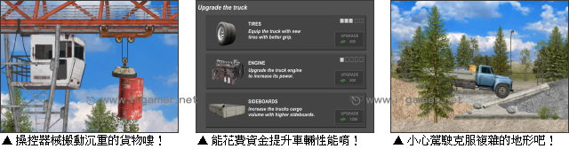 | 遊戲說明: 在《卡車載貨2》遊戲中,玩家需要發揮你的駕駛技巧,努力克服高低起伏的難纏地形,將滿滿的貨物安全送到目的地。你要在前半段化身起重機操作員,並在後半段跳上車,轉變為司機,體驗完整的裝載與配送流程。 在操作起重機時,玩家可別隨便亂扔!一旦貨物放歪或角度不對,都可能讓你之後的行程變得超級悲劇……很可能一個抖動,或是車輛重心不穩,就把東西全部扔路上啦!不過只要你順利抵達,就可以賺取獎金,用來在車庫升級卡車性能,像是提升引擎、穩定性或操控手感等等,讓之後的關卡變得稍微輕鬆一些唷!快來展現你的精準操控吧!  遊戲操作:以鍵盤 WASD 鍵或方向鍵駕駛卡車、操控鉤子,空白鍵吸附、放下貨物。