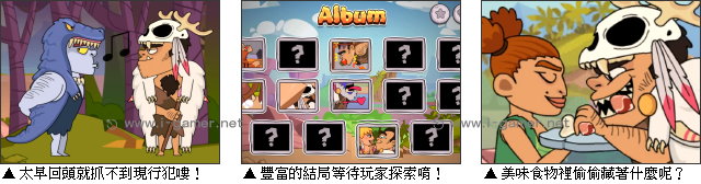 另外,刺客的手法超級多!看似美味的食物,其中可能藏著致命毒藥;明明是人類,下一秒卻變身劍齒虎,把你叼回去當寶寶們的大餐;上一任酋長的鬼魂還會趁隙奪舍,用你的身體繼續他的統治!不過無論你是順利登基還是中途陣亡,所有的結局都會收納在相簿中,玩家可以試著挑戰能不能觸發全部成就唷!