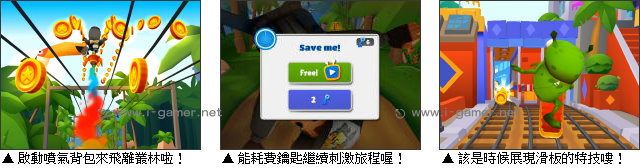 但即使如此,操作也依舊簡單順暢!玩家只要使用跳躍、閃避或下滑幾個動作,就能在列車間靈巧穿梭,收集金幣與特殊道具嘍!其中噴氣背包能讓你飛越城市上空,磁鐵能瞬間吸來滿滿金幣,而大腳鞋則能幫你跳得更高。
