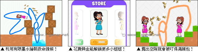 | 遊戲說明: 糟糕!可愛的小姐姐不小心驚動了蜂窩,成群結隊的戰士已經蓄勢待發,要將她叮得滿頭包!好心的玩家快發揮你聰明的大腦,拯救她於水火之中吧!你需要在有限的墨水下,動動你的手指繪製一個堅不可摧的防護罩,徹底隔絕小姐姐和蜜蜂,並且維持五秒以上。  但要小心,除了蜜蜂,有時小姐姐也會站在一些特別危險的地方,像是銳利的尖刺林,又或者是岩漿、水池,附近還可能出現炸彈!如果因為蜜蜂進攻的推力導致她落入其中受到傷害,那麼這次救援行動也會宣告失敗喔!玩家可要小心啦! 遊戲操作:以滑鼠操作進行遊戲,拖曳畫線拯救主角。