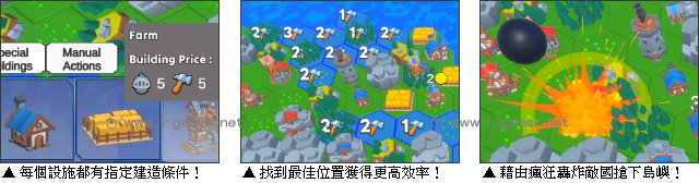 《島嶼爭霸》是一款畫風可愛,玩起來卻需要滿滿戰略思維的即時攻防遊戲。在開局時,玩家手上只有最基本的資源,得靠自己慢慢建設、壯大你的王國。每種建物都有明確的建造條件,例如房屋就需要5個食物與5個工人。