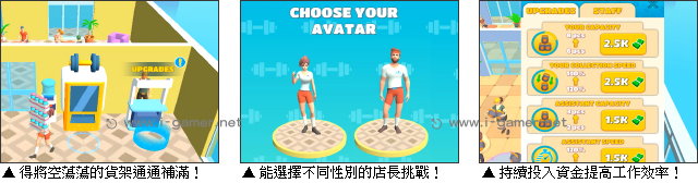| 遊戲說明: 在《健身商場大亨》遊戲中,玩家可不是準備前往健身房的那位,而是作為這體育經濟的幕後大魔王,從小小的店面起家!在開始,玩家手邊甚至只有一個貨架可以操作。你需要一邊前往倉庫搬運沉甸甸的蛋白粉來上架,一邊帶著笑容為來訪的顧客們結帳。 每天都會有想變壯、想變健康、或只是想補一下精神的客人上門,你要做的就是用最高的效率,把錢從他們的口袋中撈走!遊戲擁有幾個不同的等級商鋪,等待玩家來體驗。但在那之前,你需要先將眼前還沒被解鎖的區域開啟! 它有可能是新的商品陳列架、有可能是提升顧客滿意度的 FULLNESS 區,也可能是一條通往全新店面的通道。不過隨著店面擴大,之前的繁瑣工作當然也就可以交出去嘍!試著雇用可靠的收銀員或是補貨員,維持商場正常運作,再投入一點資金替他們升級,例如強化移動速度、每次補貨數量等等,來讓節奏更加順暢。  另外,如同之前提到的,每次升級玩家都會獲得新的挑戰。不僅是店面擴張,商品也會從最初的蛋白粉一路開到壺鈴、器材、甚至更專業的健身補劑,讓你感受到真正的擴張力量!準備好讓你的商業腦袋跟著一起練壯了嗎?現在就踏出你夢想的第一步吧!  遊戲操作:以鍵盤 WASD 鍵或方向鍵或滑鼠拖曳操控主角移動。