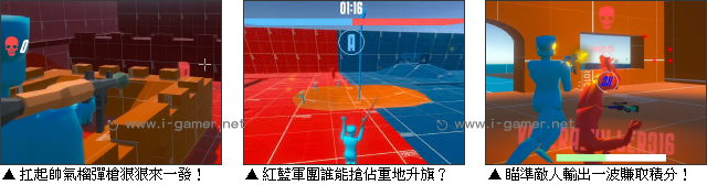 對戰的地形充滿掩蔽物,但別以為貼著牆就安全喔!經過時還是要小心確認,才不會被敵人給陰到啦!不過要注意的是,想讓團隊在最後大喊萬歲,也不是紅藍互射就行。看到位在中間的旗幟了嗎?從開始的白色,隨著搶佔重地、持續守護,才能夠升起屬於你的藍色喔!