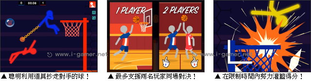 | 遊戲說明: 超 HIGH 的火柴人籃球挑戰賽正式開打,場上沒有花俏規則,只有一顆球、一個籃框,還有怎麼看都不太聽話的火柴人……在這款主打搞怪物理的籃球遊戲中,玩家的操控相當單純,就是在限制時間內努力讓他順利抓到球,並且移動到對手籃框位置將球搞進去。 遊戲支援單人模式與雙人對決,玩家可以選擇和電腦較量,也能拉上朋友!但要注意,如果是跟朋友對抗,有趣的道具就會被關閉。你不能使用鎖鍊大老遠抄走球,也不能一下子變大對手籃框!聽起來好像有點可惜? 但別擔心,特色亮點依然不會少,只要得分,玩家就可以切換遠近鏡頭,好好欣賞下火柴人以奇妙姿勢把球送進籃框的那個瞬間嘍!想輕鬆來一場亂七八糟的比賽嗎?現在就打開遊戲,進行挑戰吧!  遊戲操作:P1- 鍵盤 WASD 鍵移動。 P2- 鍵盤方向鍵移動。