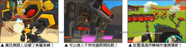 | 遊戲說明: 《機械亂鬥》是一款快節奏的迎面槍戰遊戲,美麗的島嶼被失控機器人佔據,你得在滿地廢墟與爆炸聲中殺出一條生路。子彈狂掃、火花亂炸,滿滿的機器人將從四面八方向你撲進,戰場就是一團混亂。你的目標沒有別的,就是在限制時間內盡可能摧毀更多敵人!  想活下來,你就必須邊跑邊射,邊躲邊撿補給,喜歡大亂鬥遊戲的玩家,可千萬別錯過啦!遊戲中的地圖各有特色,玩家可以選擇不同區域挑戰。你還能與電腦夥伴聯手,組成小隊相互掩護,在限制時間內努力累積更多的積分。而在這之中,最重要的就是補給了。四處散落的彈匣和武器將是你續命的關鍵,一旦撿到火力威猛的槍,輸出就瞬間翻倍啦!  若覺得手感還沒調整好,也能先到射擊場暖暖身,習慣一下唷!另外,除了主線,開發者還準備了紓壓的 Fun 模式。玩家能自由放飛,像在地圖上擺滿炸藥桶一次點燃,看著成堆的機器人瞬間炸成煙火唷!現在就把槍上膛,島嶼反擊戰即將開打啦! 遊戲操作:以鍵盤 WASD 鍵或方向鍵移動,空白鍵跳躍,Shift 鍵奔跑,數字鍵 1~3 鍵切換武器。