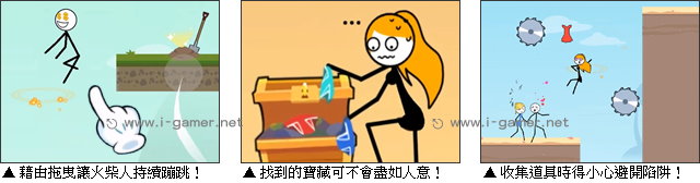 | 遊戲說明: 超惡搞的火柴人遊戲又來啦!在這次的《火柴人飛躍挑戰》遊戲中,玩家需要藉由不斷向某個方向拖曳,才能讓我們的主角持續移動,並且觸碰到該回合的目標!這個目標相當多變,它有可能是佇立在山頂上的一間廁所,也有可能是不為人知的寶藏,又或者是莫名其妙出現在沙漠裡的浴缸……  但無論它多古怪,玩家要做的,就是閃過包含輪鋸、炸彈在內的致命障礙,抵達心之所向。而隨著關卡推進,在這個蹦蹦跳跳的過程中,玩家有時還不能只往終點衝,需要先取得關鍵道具才能觸發事件!你可要多多留意嘍! 遊戲操作:以滑鼠操作進行遊戲,左鍵拖曳操控火柴人跳躍。