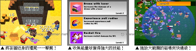 | 遊戲說明: 在這款完美致敬經典《吸血鬼倖存者》與《我的世界》元素的肉鴿遊戲中,玩家將來到這個充滿殭屍與不死怪物的瘋狂世界,為了活下去而不斷奔跑。這裡沒有安全區,也沒有庇護所,在還不夠能力回擊的情況下,玩家能做的,就只有發揮風騷的走位,努力打帶跑。 遊戲分為戰役及生存模式兩種。前者玩家需要應付包含魔王級角色在內的16波攻勢,後者則要挑戰活過20分鐘。不過無論你選擇的是哪個模式,只有勝利條件差異,其餘玩法都是相同的。 在剛踏入戰場時,你需要擊倒妄圖近身的怪物,以從它們身上取得能量球。要知道,這些可是成長的關鍵唷!玩家只要填滿能量條,就可以獲得升級,從多種技能與武器中自行選擇一項,並逐步堆疊出屬於自己的戰鬥風格。  你可以使用機槍、霰彈槍掃射敵群,也能解鎖火焰噴射器、雷射等高破壞力武裝,甚至施放大範圍磁場或引爆炸藥,瞬間清場,越到後期,爽度越高唷!不過火力再強,還是要顧好血量,如果太低記得找到急救包觸發,否則再華麗的配置都可能一瞬間瓦解呢!  另外,每當你完成當前地圖的挑戰,就可以解鎖全新區域,感受更不一樣的風格,喜歡這種在怪海中掙扎求生,苟到最後享受成長與爆發的你,可千萬別錯過這款《吸血鬼倖存者》啦! 遊戲操作:以鍵盤 WASD 鍵或方向鍵移動,空白鍵射擊。