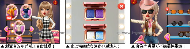 玩家需要從化妝開始,其中眼影及口紅色彩挑得夠好,才能讓五官更迷人!接下來就是打開那塞爆的衣櫃,看看哪些單品穿起來更加適合泰勒絲的風格。當然,身為大明星,帥氣的墨鏡可是穿搭中絕對不能漏掉的靈魂配件!快來展現你的職人品味,幫助泰勒絲引領下一波流行吧!