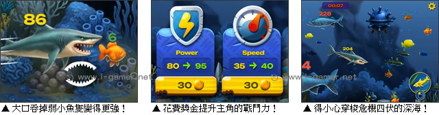 不過要注意的是,這魚也不是每隻都能吃!依據弱肉強食的守則,玩家只能吞掉那些數字比自己小的魚兒,而面對用紅字強調的恐怖威脅,則得適時使用加速拉開距離,逃到較為安全的區域唷!現在就跳進這場血腥又迷人的深海派對,看看你到底能吃多飽吧! 遊戲操作:以鍵盤 WASD 鍵或滑鼠移動操控鯊魚,空白鍵或滑鼠左鍵加速。