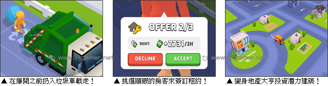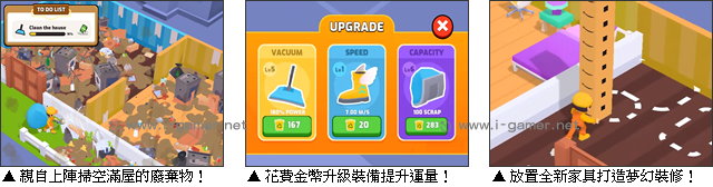 | 遊戲說明: 想翻身成為身價破億的地產大亨嗎?現在就進軍房地產市場,開啟你的致富傳奇吧!這座城市隱藏著許多乏人問津的廢棄老屋,雖然看起來像堆滿垃圾的荒廢現場,但在眼光精準的你眼中,這些全是等待發掘的金礦……準備好投入你的第一筆資金,收購低價老屋,展開從無到有的華麗大翻身了嗎?  不過想成為大亨,這路還有得走!你需要先放下身段,為了精簡費用,拿起工具親自上陣。看著堆積如山的垃圾、舊物,以及到處亂爬的蟑螂和老鼠……沒有二話,拿起吸塵器就是一頓狂吸!吸到庭院和房子從髒亂廢墟變回原本的清爽。不過這些雜七雜八的東西實在有點多,如果吸塵器滿載,玩家也別忘了利用等待在外的垃圾車好好清空,從中賺取回收費用,用來投資清潔裝備,提升清運速度與效率喔!  另外,當屋子打掃乾淨,玩家還得走最後一哩路,拆開剛運到的箱子,將嶄新的家具一個個放好,讓垃圾屋瞬間變身人人搶著住的夢幻宅喔!至於這夢幻宅會落到誰手裡?看到門口的看屋人潮了嗎?你得評估房客提出的價格,找到大金主成交呢!而隨著資金越來越雄厚,玩家也能夠入手更大間、地段更精華的房產,建立起屬於你的租屋帝國喔!現在就開始你的炒房大戰吧! 遊戲操作:以鍵盤 WASD 鍵或方向鍵或滑鼠拖曳操控主角移動。
