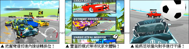 | 遊戲說明: 在《瘋狂賽車》遊戲中,玩家將來到一場強調特技跳躍與暴力美學的狂歡!為了贏得比賽,你需要駕駛性能剽悍的汽車,在充滿障礙物的賽道上風馳電掣。為了爭取速度上的優勢,玩家除了利用一個個跳台進行長距離飛躍,在彎道中把握時機切進內線,還得抓準時機燃燒氮氣,才能在直線賽道將對手甩得遠遠。  遊戲提供了幾款賽車玩法,除了純粹考驗車技的競速,還有混亂無比的極限特技模式!而在這之中,只要贏得前三名,玩家就可以賺取獎金,解鎖風格迥異的全新車輛,讓下次對峙更加輕鬆喔!現在就跳入軌道,重踩油門,爭取在這場瘋狂賽事中奪下冠軍寶座吧! 遊戲操作:以鍵盤 WASD 鍵或方向鍵駕駛,空白鍵煞車,Shift 鍵加速,R 鍵重置車輛,C 鍵切換視角。