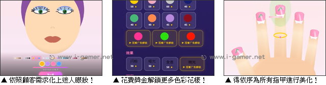 | 遊戲說明: 頂級沙龍開張啦!在這裡,玩家將為每一位追求完美的女神提供最精緻的改造服務。店裡主打美甲、唇妝、眼妝以及臉部保養四大類別,當顧客進店並遞出心儀的參考照片時,玩家得努力還原那些細節,從眼影的層次、口紅的亮度到指甲的法式彩繪,才能獲得五顆星好評唷!  在美甲區,你需要從修型、除掉死皮開始,後續再塗抹色彩、貼上貼紙以及照燈硬化;在化妝區,玩家則得挑選最合適的粉底與打亮,才能打造完美無瑕的陶瓷妝容喔!另外,每次改造賺取的獎金,玩家也別忘了購買更多的道具,讓服務更加升級唷!現在就發揮你的巧手,讓女孩們都展現煥然一新的華麗樣貌吧! 遊戲操作:以滑鼠操作進行遊戲,左鍵點擊或拖曳工具進行美容。